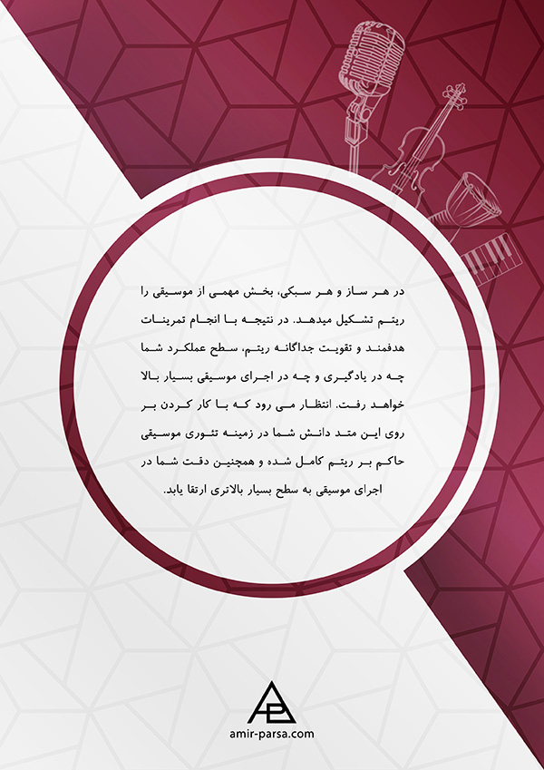 در هر ساز و هر سبکی، بخش مهمی از موسیقی را ریتم تشکیل می دهد. در نتیجه با انجام تمرینات هدفمند و تقویت جداگانه ریتم، سطح عملکرد شما چه در یادگیری و چه در اجرای موسیقی بسیار بالا خواهد رفت. این کتاب شامل ده فصل می باشد که از ابتدایی ترین تا پیشرفته ترین مباحث مربوط به ریتم را به زبان ساده توضیح داده و برای تمامی دروس و مباحث مثال ها و تمریناتی ارائه شده که اجرای آن ها در سی دی همراه کتاب موجود می باشد.
